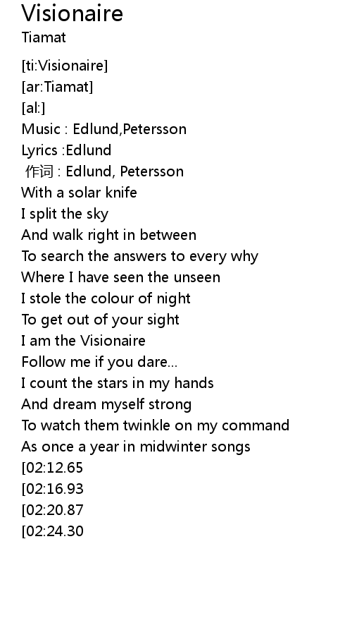 | [03:59.65][02:20.87] | I am the Visionaire |