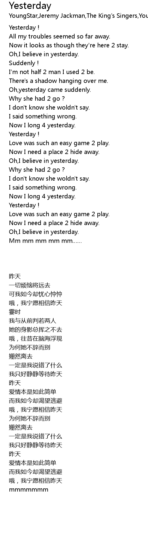 | [00:38.600] | Oh,yesterday came suddenly. |
