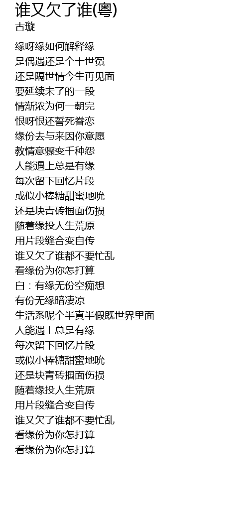 | Song | 谁又欠了谁(粤) |