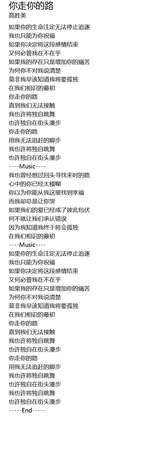 | [01:09.72] | nǐ zǒu nǐ de lù |