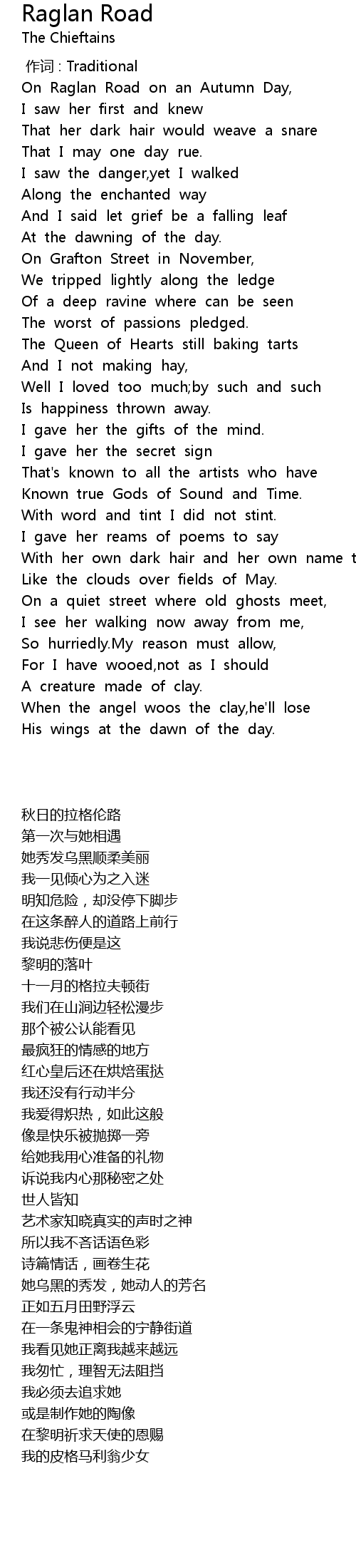 | [00:01.816] | On Raglan Road on an Autumn Day, |