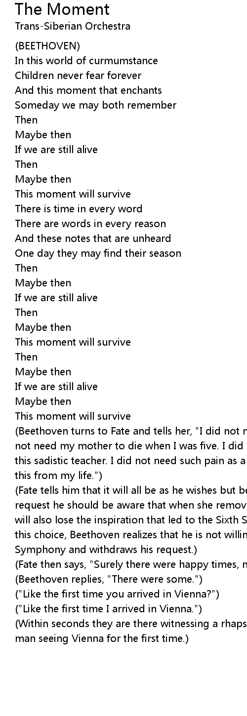 (Fate tells him that it will all be as he wishes but before she grants his request he should be aware that when she removes the pains of his childhood he will also lose the inspiration that led to the Sixth Symphony. When faced with this choice, Beethoven realizes that he is not willing to lose the Sixth Symphony and withdraws his request.) |