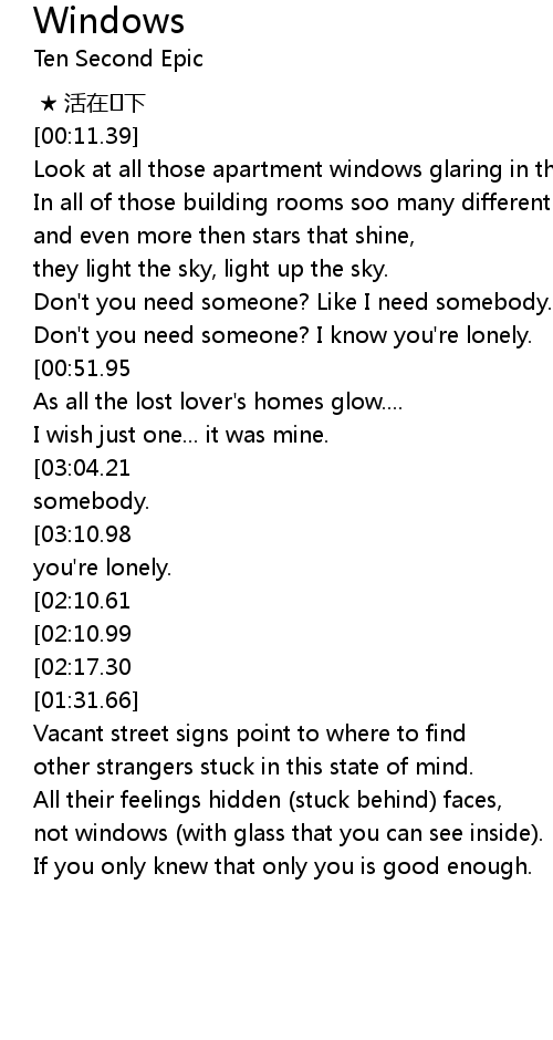 | [00:14.06] | Look at all those apartment windows glaring in the night. |