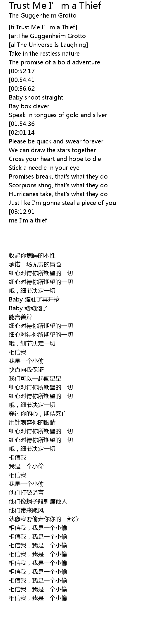 | [03:08.60][03:12.91][03:43.30][03:39.11][03:34.52][03:30.20][03:26.80][03:21.38][03:16.58] | Trust me I' m a thief |