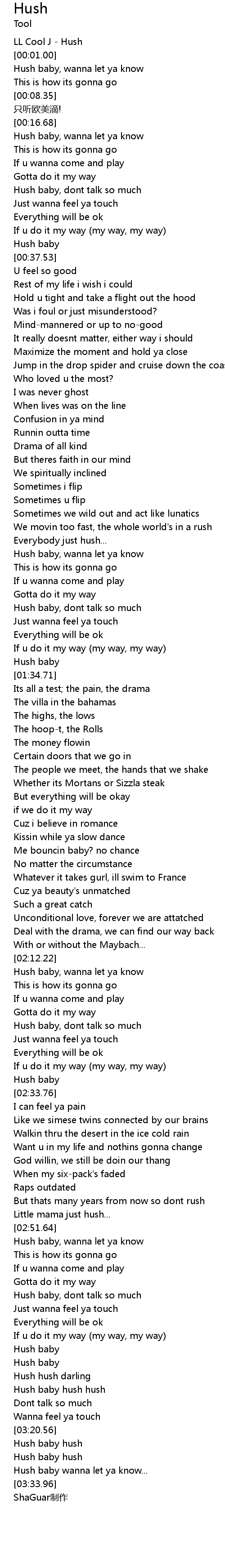 | [03:01.31] | Hush baby, dont talk so much |