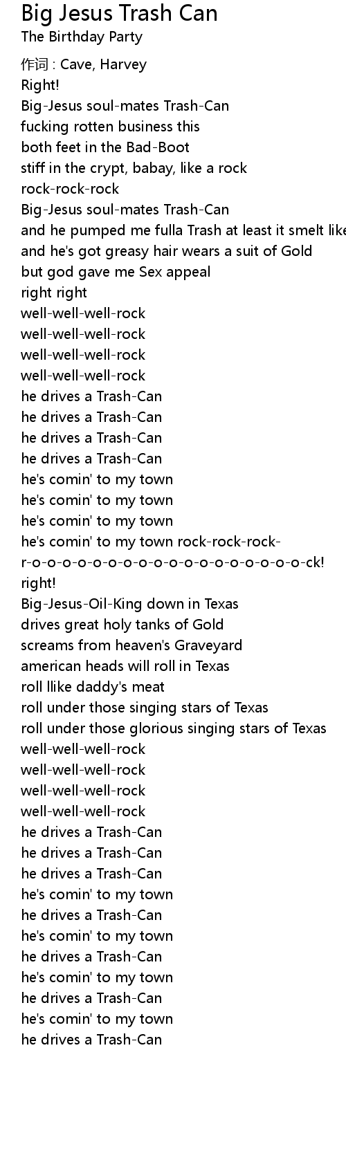 | Song | Big Jesus Trash Can |