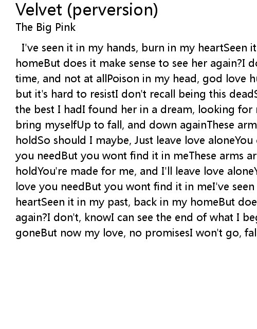 I've seen it in my hands, burn in my heartSeen it in my past, back in my homeBut does it make sense to see her again?I don't, knowI felt it for some time, and not at allPoison in my head, god love hurtsI'm not looking for love, but it's hard to resistI don't recall being this deadShe's the only one, lost the best I hadI found her in a dream, looking for meThis heart's on fire, I'll bring myselfUp to fall, and down againThese arms of mineDon't mind who they holdSo should I maybe, Just leave love aloneYou call out my name, for the love you needBut you wont find it in meThese arms are mineDon't mind who they holdYou're made for me, and I'll leave love aloneYou call out my name for the love you needBut you wont find it in meI've seen it in my hands, burn in my heartSeen it in my past, back in my homeBut does it make sense to see her again?I don't, knowI can see the end of what I begunA tale of a love, come and goneBut now my love, no promisesI won't go, falling in love |