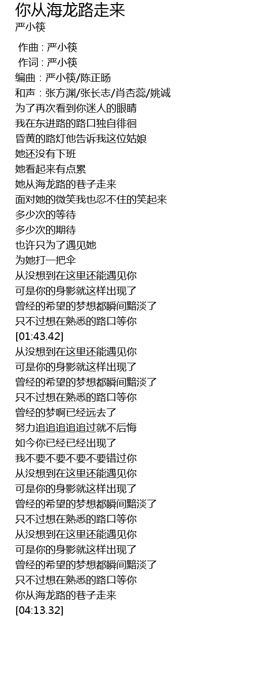 | [04:12.16] | 你从海龙路的巷子走来 |