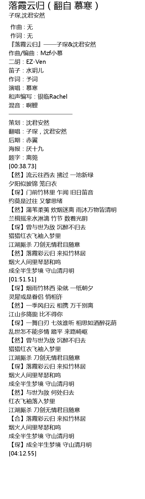 | [00:03.22] | 『落霞云归』——子琛&沈君安然 |