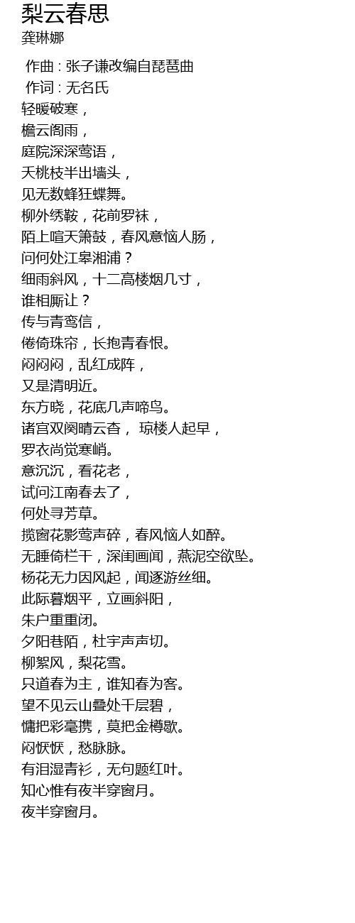 | [04:10.38] | 无睡倚栏干,深闺画闻,燕泥空欲坠。 |