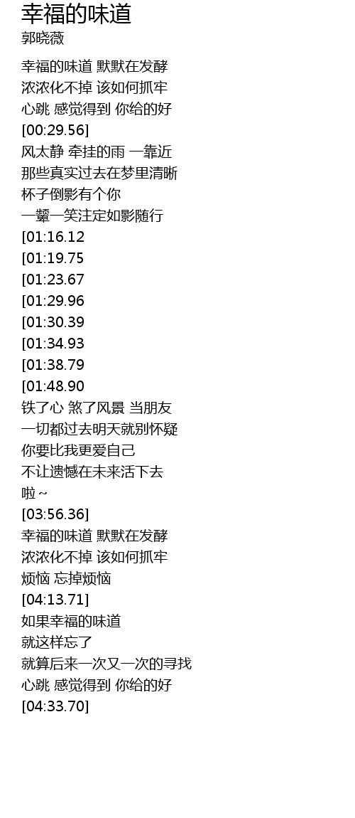 | [02:35.65][01:16.12] | 幸福的味道 怎么忘得了 |
