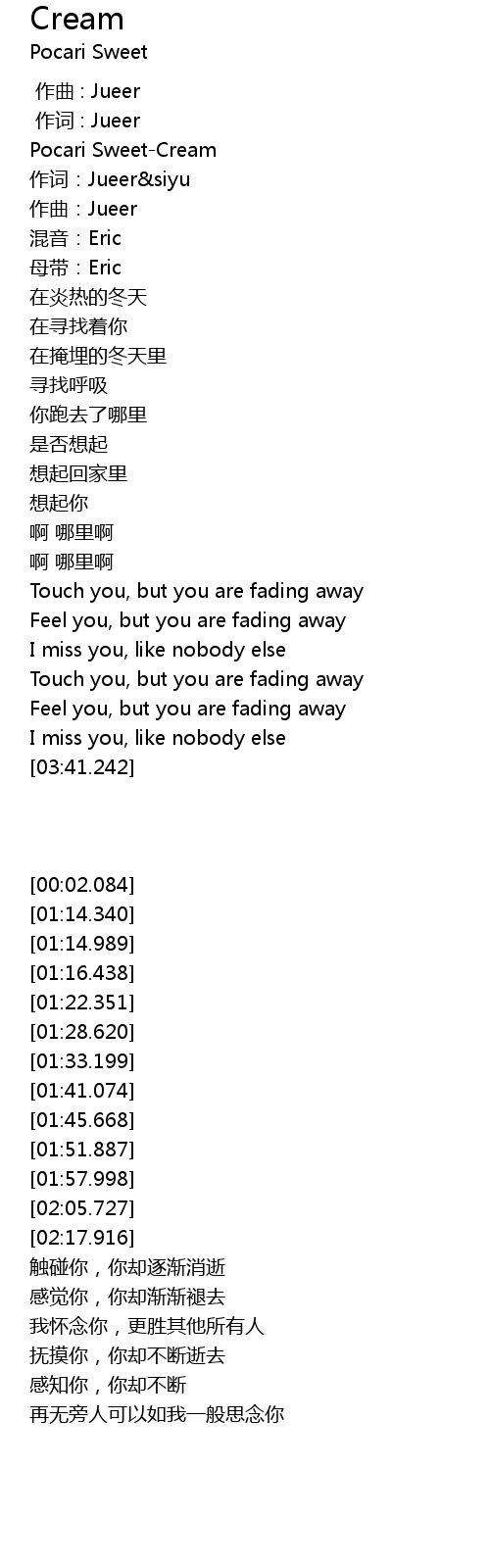 | [01:41.074] | nǐ pǎo qù le nǎ lǐ |
