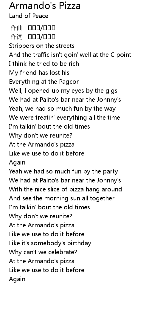 | [02:03.83] | We had at Palito' s bar near the Johnny' s |