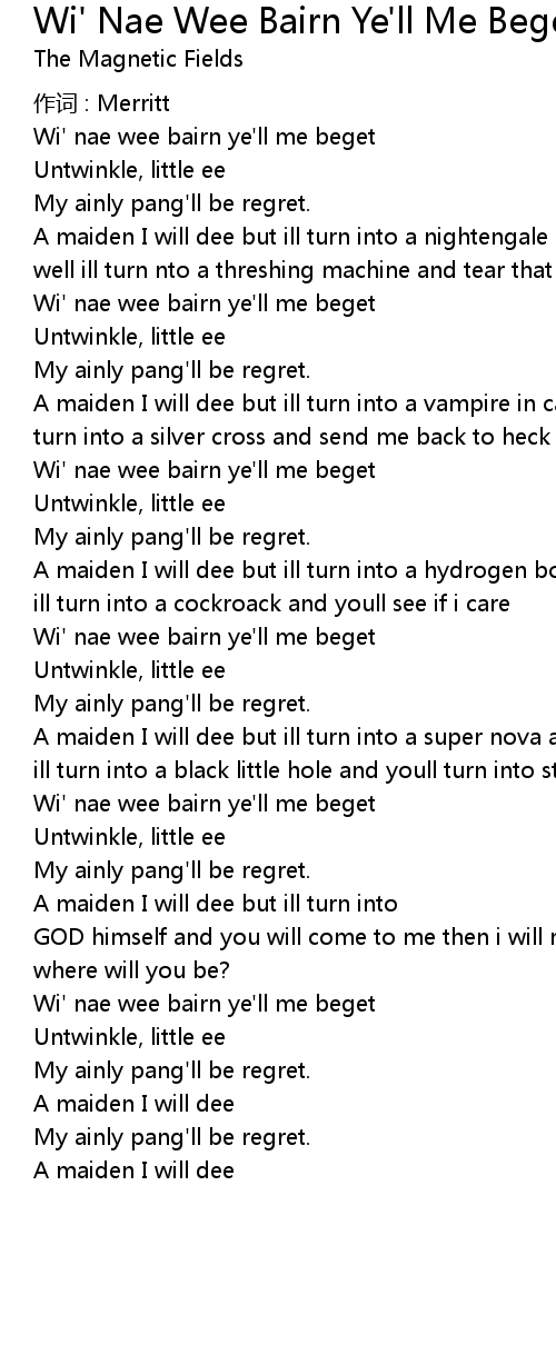 | Wi' nae wee bairn ye' ll me beget | |