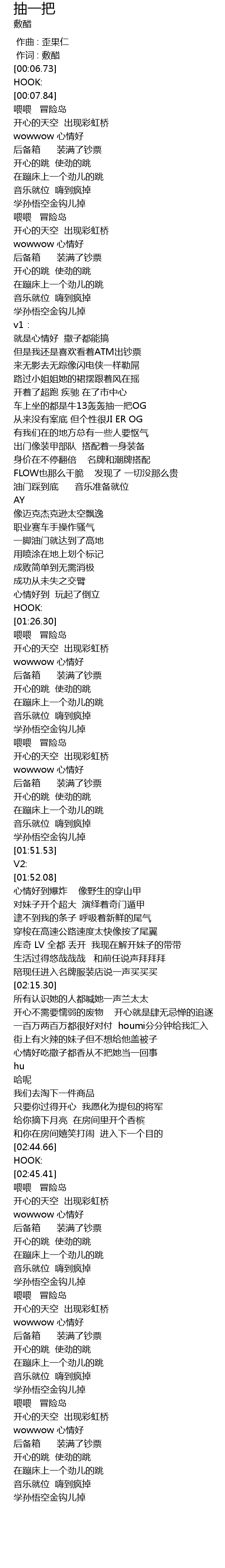 | [00:49.62] | chē shàng zuò de dōu shì niú 13 hōng hōng chōu yī bǎ OG |