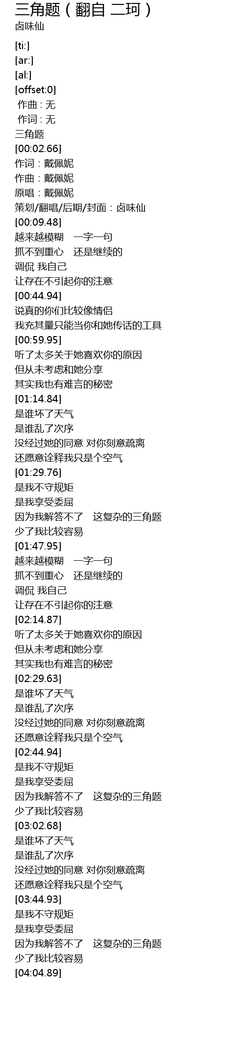 | [00:06.48] | 策划/翻唱/后期/封面:卤味仙 |
