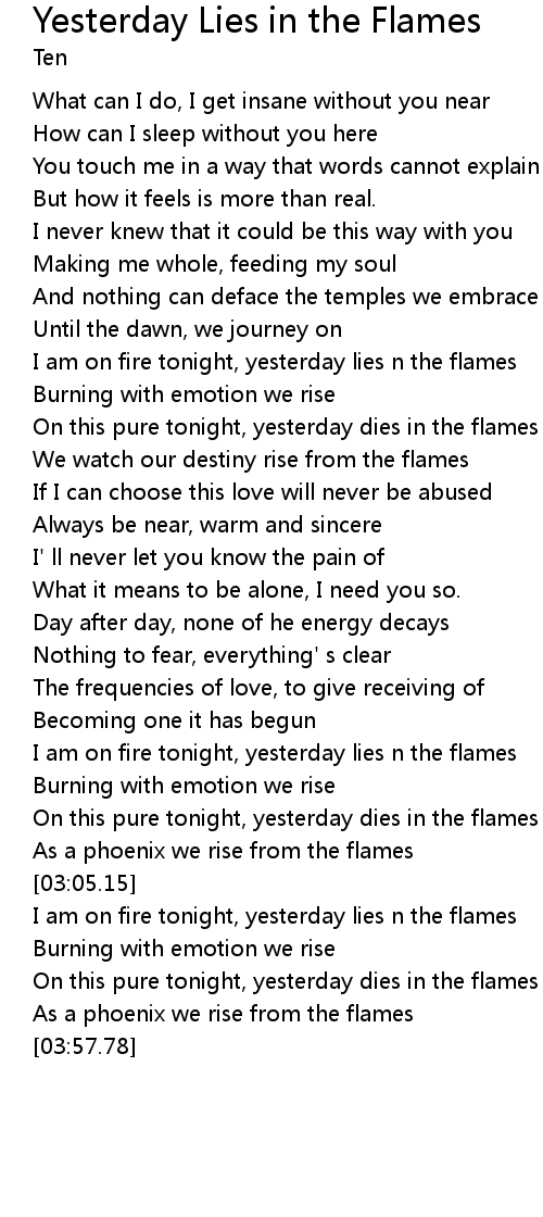 | [01:13.52] | I am on fire tonight, yesterday lies n the flames |