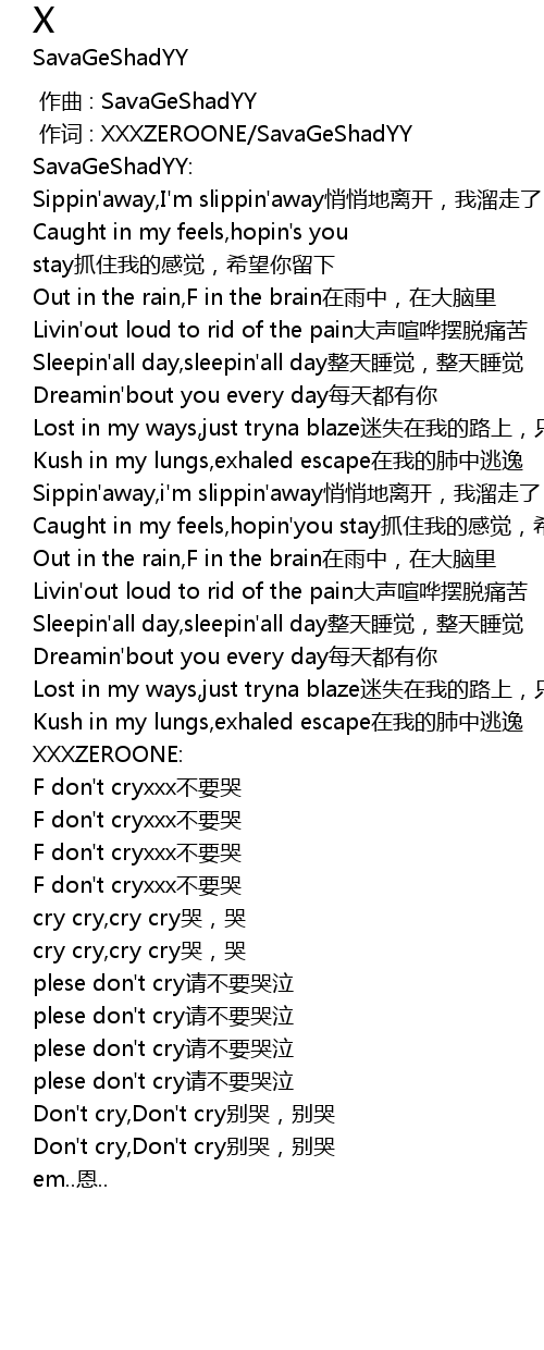 | [00:01.000] | 作词 : XXXZEROONE/SavaGeShadYY |