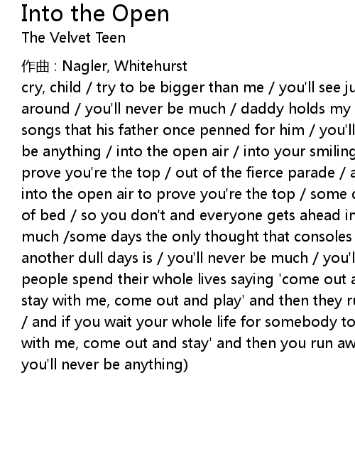 | cry, child / try to be bigger than me / you'll see just how fast it all comes around / you'll never be much / daddy holds my head while i sleep / sing me songs that his father once penned for him / you'll never be much / you'll never be anything / into the open air / into your smiling mug / into the open air to prove you're the top / out of the fierce parade / and into your smiling mug / into the open air to prove you're the top / some days you don't want to get out of bed / so you don't and everyone gets ahead in the world / you'll never be much /some days the only thought that consoles your tired head at the close of another dull days is / you'll never be much / you'll never be anything (some people spend their whole lives saying 'come out and play with me, come out and stay with me, come out and play' and then they run away / they'll never be much / and if you wait your whole life for somebody to say to you 'come out and play with me, come out and stay' and then you run away / you'll never be much / you'll never be anything) |