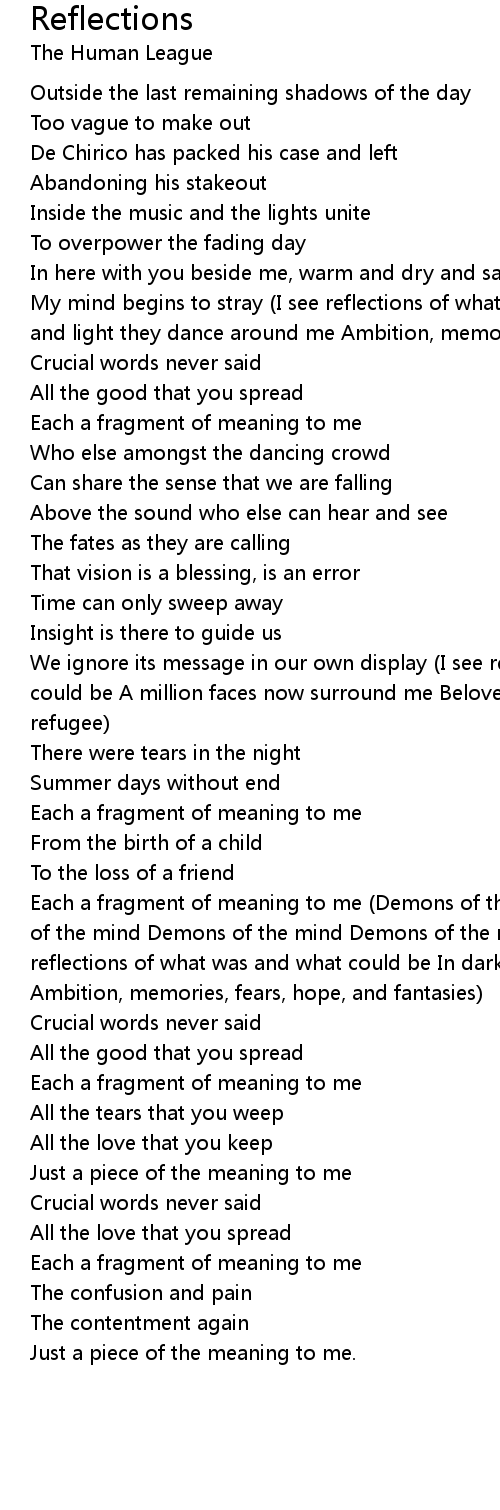 My mind begins to stray (I see reflections of what was and what could be In dark and light they dance around me Ambition, memories, fears, hope and fantasies) |