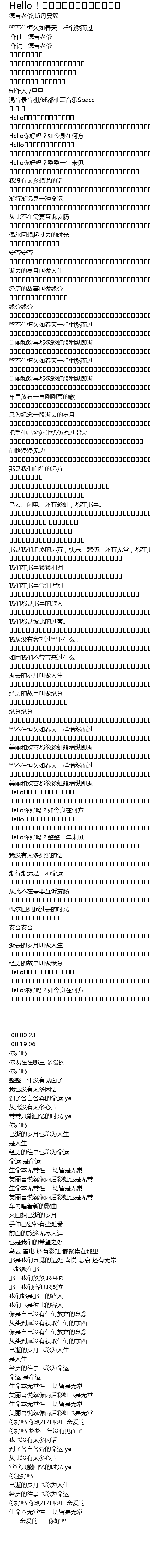 | [03:17.399] | Hello你好吗?如今身在何方 |