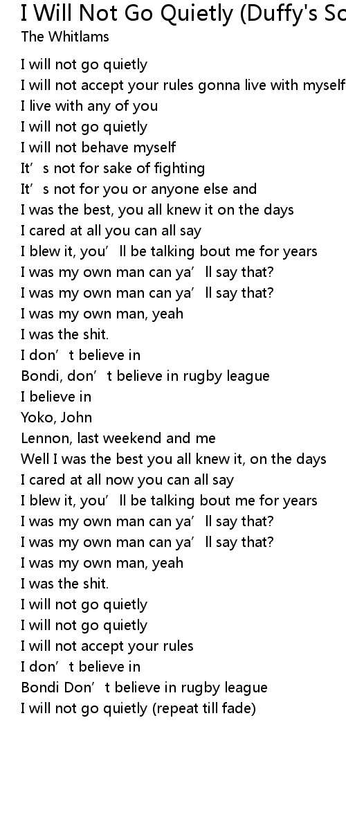 | Song | I Will Not Go Quietly (Duffy's Song) |