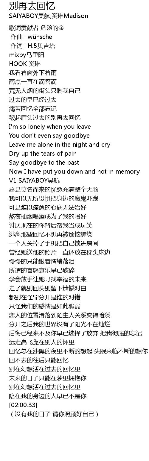 | [00:26.80] | zhòu qǐ méi tóu guò qù de bié zài qù huí yì |