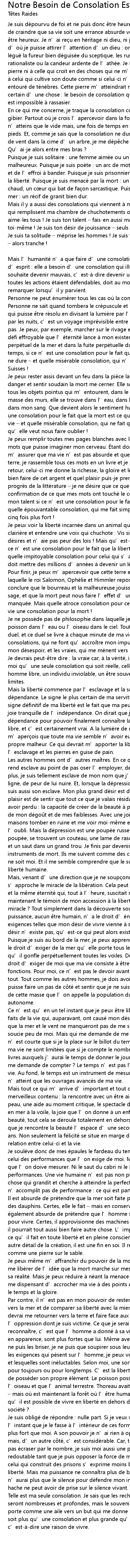 | Telle est ma seule consolation. Je sais que les rechutes dans le de sespoir seront nombreuses et profondes, mais le souvenir du miracle de la libe ration me porte comme une aile vers un but qui me donne le vertige : une consolation qui soit plus qu' une consolation et plus grande qu' une philosophie, c' esta dire une raison de vivre. |