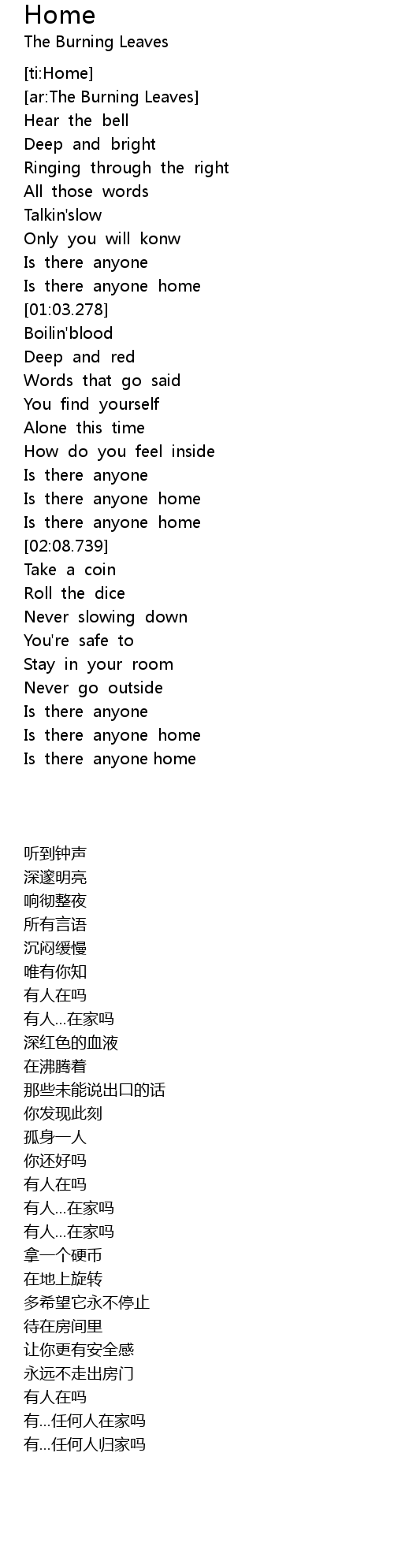 | [03:00.599] | Is there anyone home |