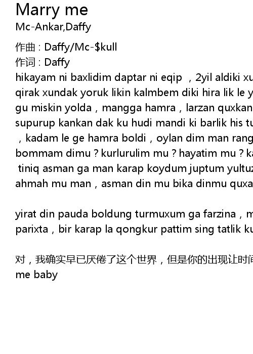 | duì, wǒ què shí zǎo yǐ yàn juàn le zhè gè shì jiè, dàn shì nǐ de chū xiàn ràng shí jiān lǐ chōng mǎn le farzina, jiù zhè yàng jiē zhe xiě, wǒ mǎn nǎo huí xiǎng zhe yí gè shēng yīn wèi nǐ dài shang jié hūn zuàn jiè, 3 nián de shí jiān yě xǔ bìng bù tài zhǎng, nǐ wǒ zài yì qǐ de xǐ nù āi yuè tián mì yě yǒu gǎn shāng, wǒ yǒu shí ràng nǐ liú lèi, nǐ yǒu shí ràng wǒ gǎn dào fēng kuáng, dàn shì fēn bù kāi de rú jiāo sì qī zhǐ yǒu nǐ wǒ fēn xiǎng, wǒ pí qì bào wǒ zhī dào, wǒ bù gòu hǎo wǒ zhī dào, ér nǐ zǒng shì miàn dài wēi xiào duì wǒ bù lí bù qì wǒ yě zhī dào, zhǐ yǒu nǐ de pí qì cái néng ràng wǒ shén hún diān dǎo, jīng huāng shī cuò de bù zhī rú hé shì hǎo, qiān yán wàn yǔ dōu yǐ jīng wèi nǐ biàn de wú lì, bù guǎn shàng tiān rú hé kǎo yàn wǒ bǎ tā gū lì, xiē sī dǐ lǐ dōu huì dàn qù, zhǐ shèng xià ài nǐ, jiù zài jīn wǎn cǐ shí cǐ kè marry me baby |