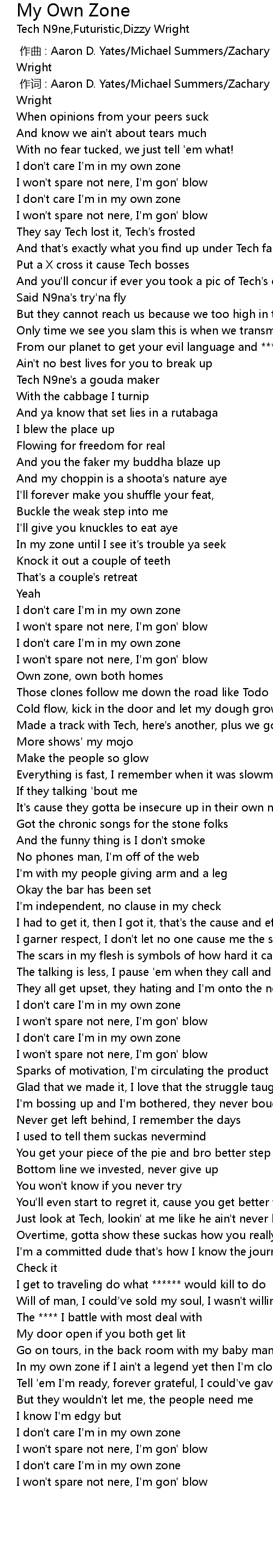 | [00:20.23] | I don' t care I' m in my own zone |