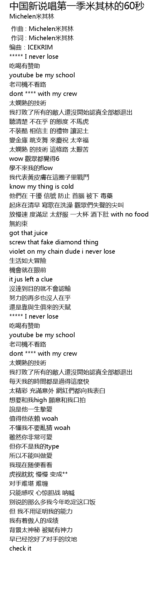 | [00:00.643] | zuò cí : Michelen mǐ qí lín |