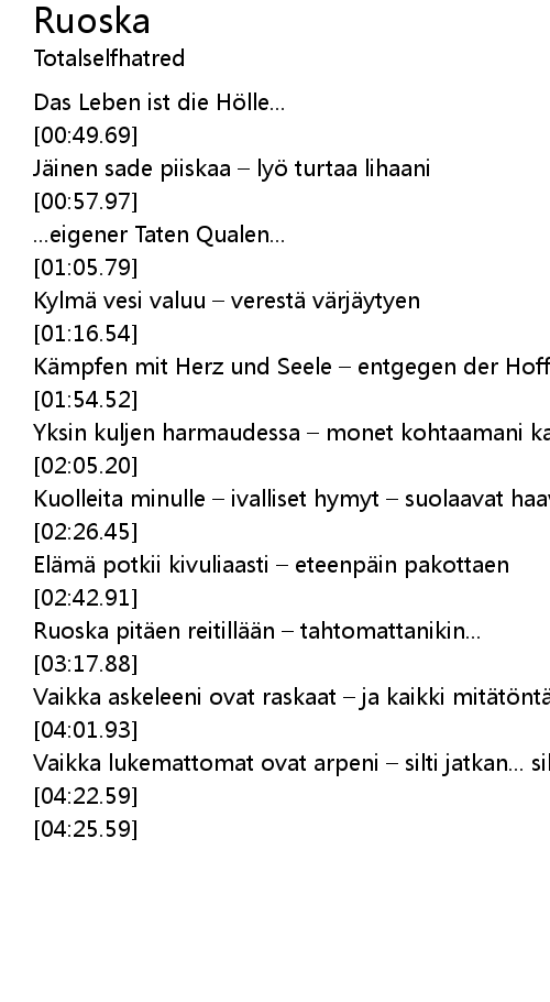 | [00:49.86] | Jäinen sade piiskaa – lyö turtaa lihaani |