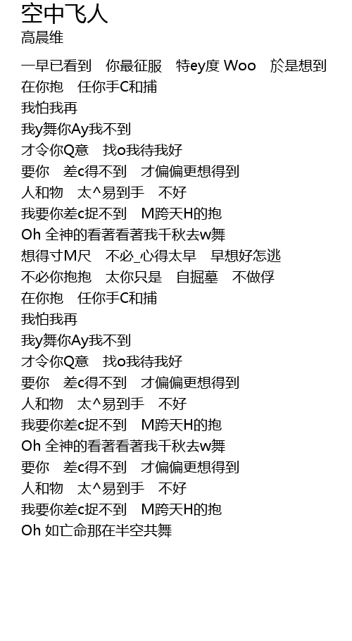 | [03:34.31] | wǒ yào nǐ chà c zhuō bú dào M kuà tiān H de bào |