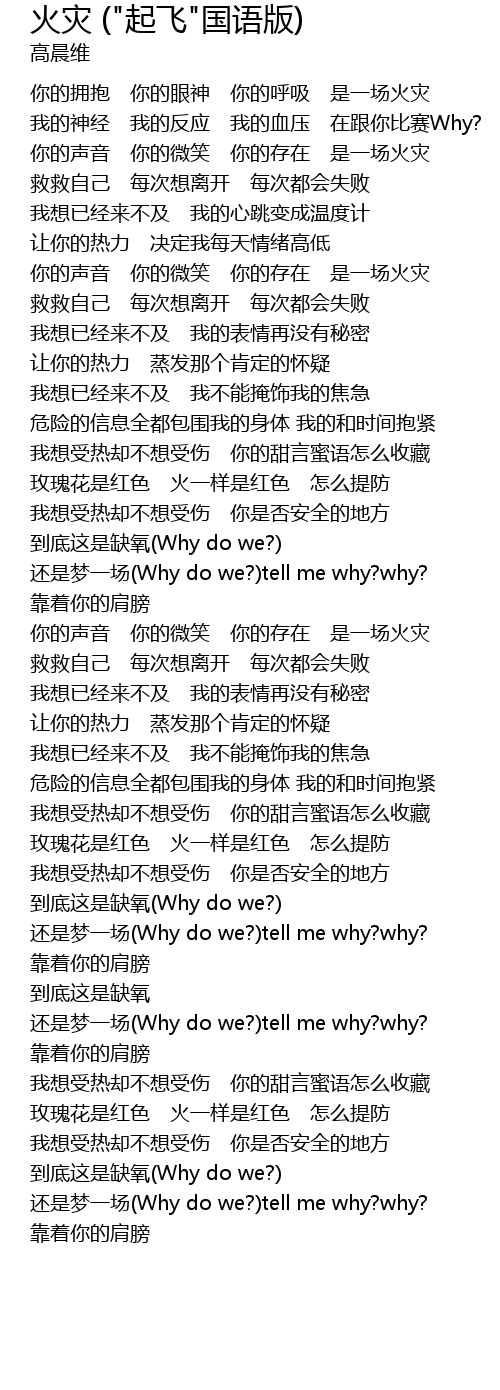 | [00:43.13] | 你的声音 你的微笑 你的存在 是一场火灾 |