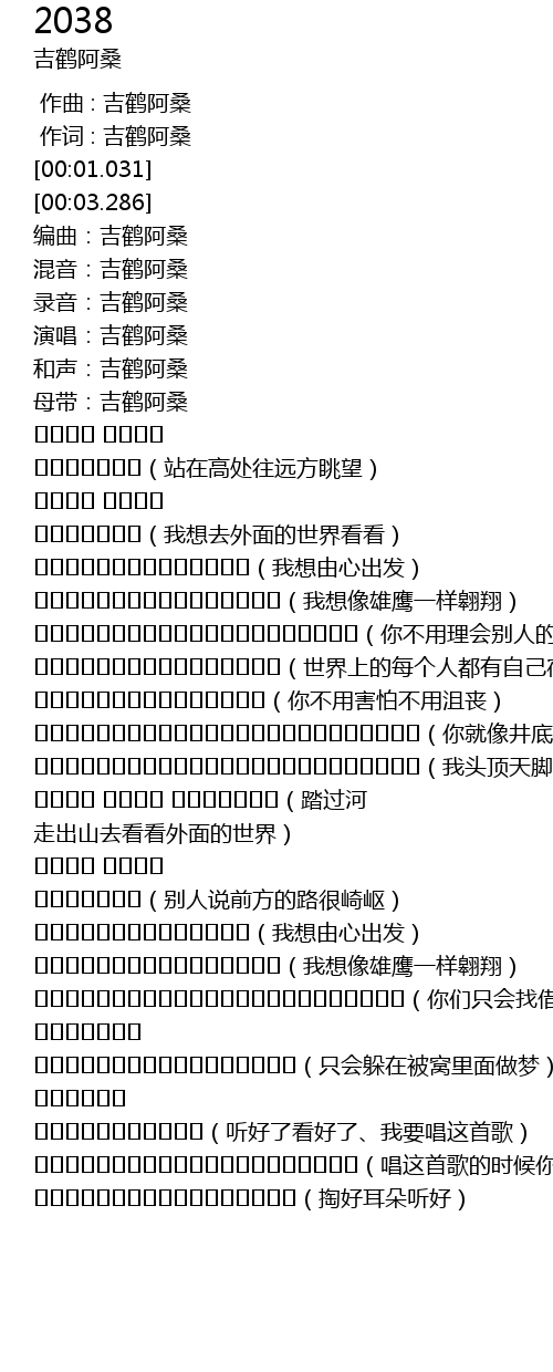 | [01:46.131] | ꒊꃀꈭꄉ ꃪꄩꈴꄉ ꆀꃅꇓꈓꉜꁧꂯ(踏过河 走出山去看看外面的世界) |