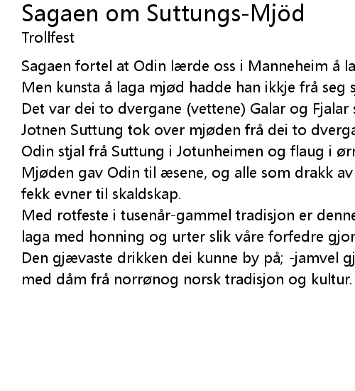 | Med rotfeste i tusen rgammel tradisjon er denne mj den, v r nordiske vin, laga med honning og urter slik v re forfedre gjorde det. | |