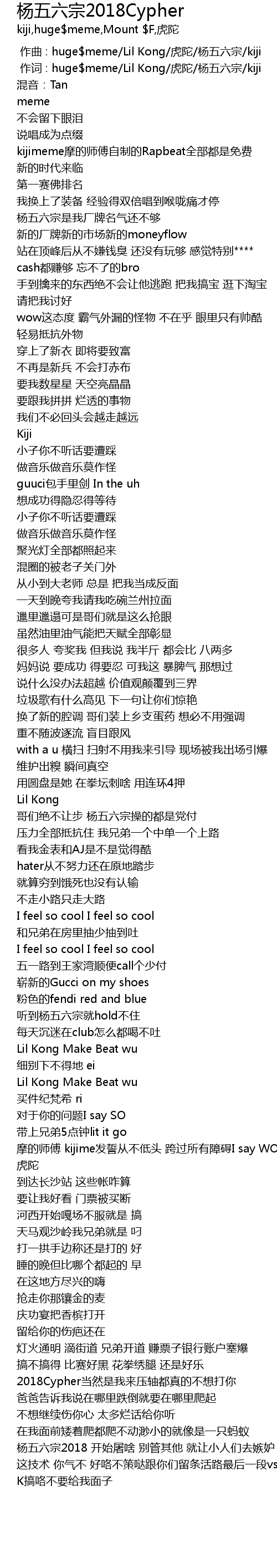 | [00:01.000] | 作词 : huge$meme/Lil Kong/虎陀/杨五六宗/kiji |