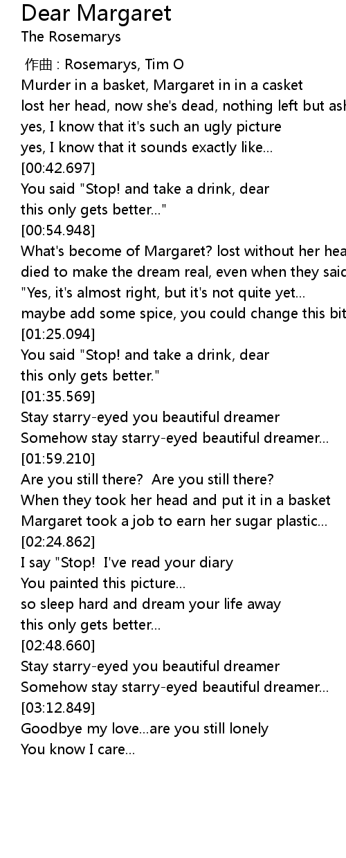 | [01:01.009] | What' s become of Margaret? lost without her head |