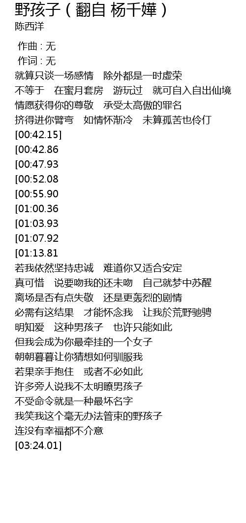 | [02:23.53][01:07.92] | 笑我这个毫无办法管束的野孩子 |