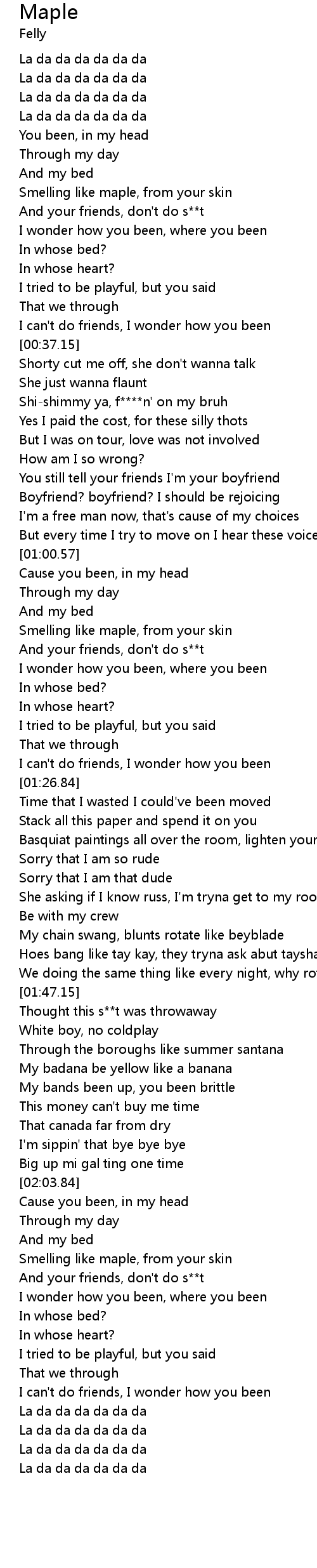 | [00:35.18] | I can't do friends, I wonder how you been |