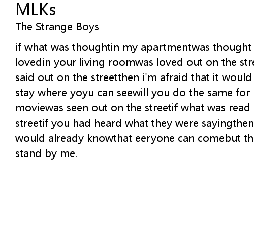 if what was thoughtin my apartmentwas thought out on the streetif what was lovedin your living roomwas loved out on the streetif what was saidin my bedwas said out on the streetthen i'm afraid that it would beonly you and meso i'll stay where yoyu can seewill you do the same for meif what was seen in the moviewas seen out on the streetif what was read in the bookwas read out on the streetif you had heard what they were sayingthen martin luther kingsthen you would already knowthat eeryone can comebut that i want to sit by youdo you wanna stand by me. |