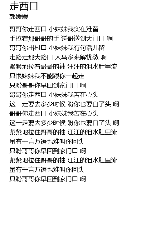 | [02:34.52] | gē ge nǐ zǒu xī kǒu xiǎo mèi mei wǒ kǔ zài xīn tóu |