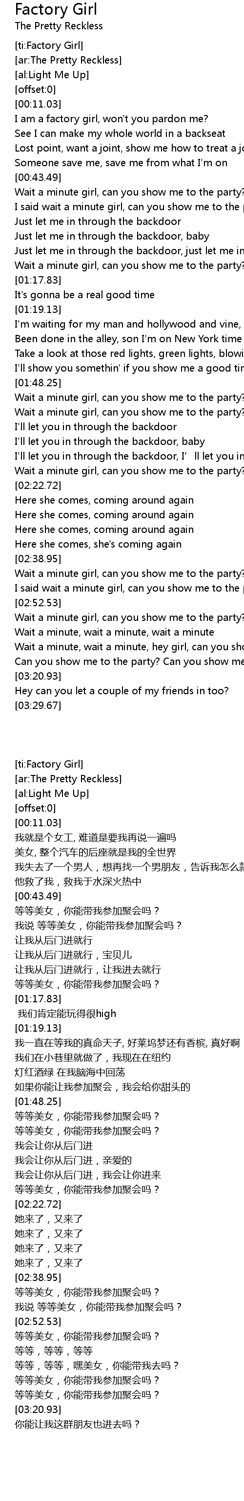 | [00:22.24] | I am a factory girl, won' t you pardon me? |