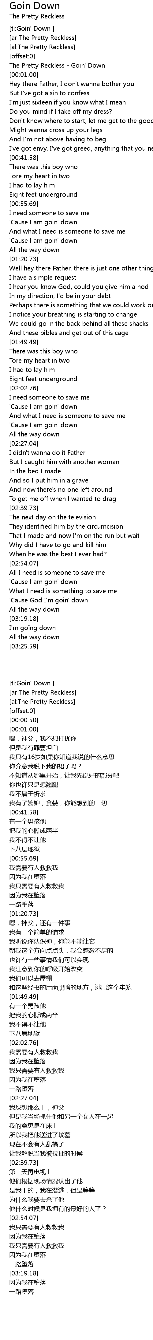 | [00:00.50] | The Pretty Reckless - Goin' Down |