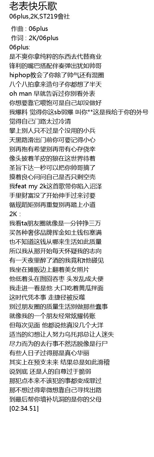 | [01:06.95] | 我爆料 觉得你这sb弱爆 叫你**这是我给于你的外号 |