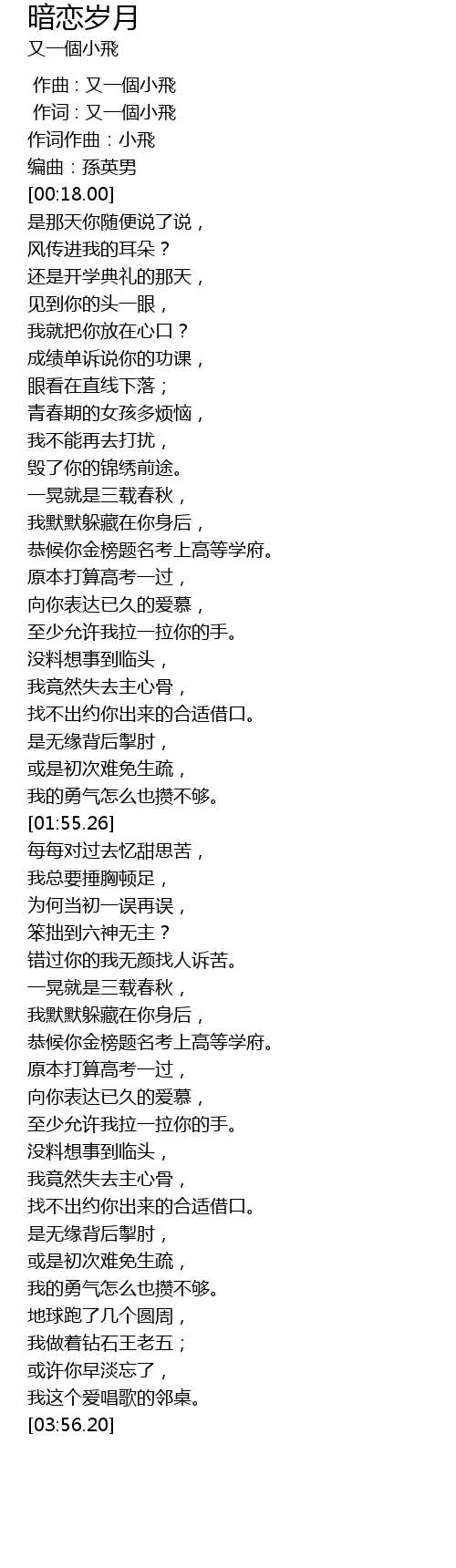 | [00:01.000] | 作词 : 又一個小飛 |