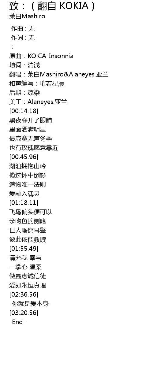 | [00:06.18] | 翻唱:茉白Mashiro&Alaneyes.亚兰 |