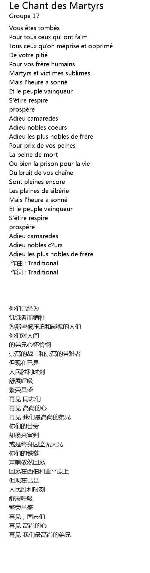 | Song | Le Chant des Martyrs |
