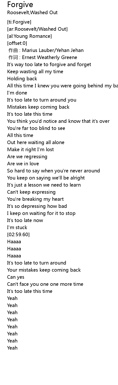 | [00:20.53] | It's way too late to forgive and forget |